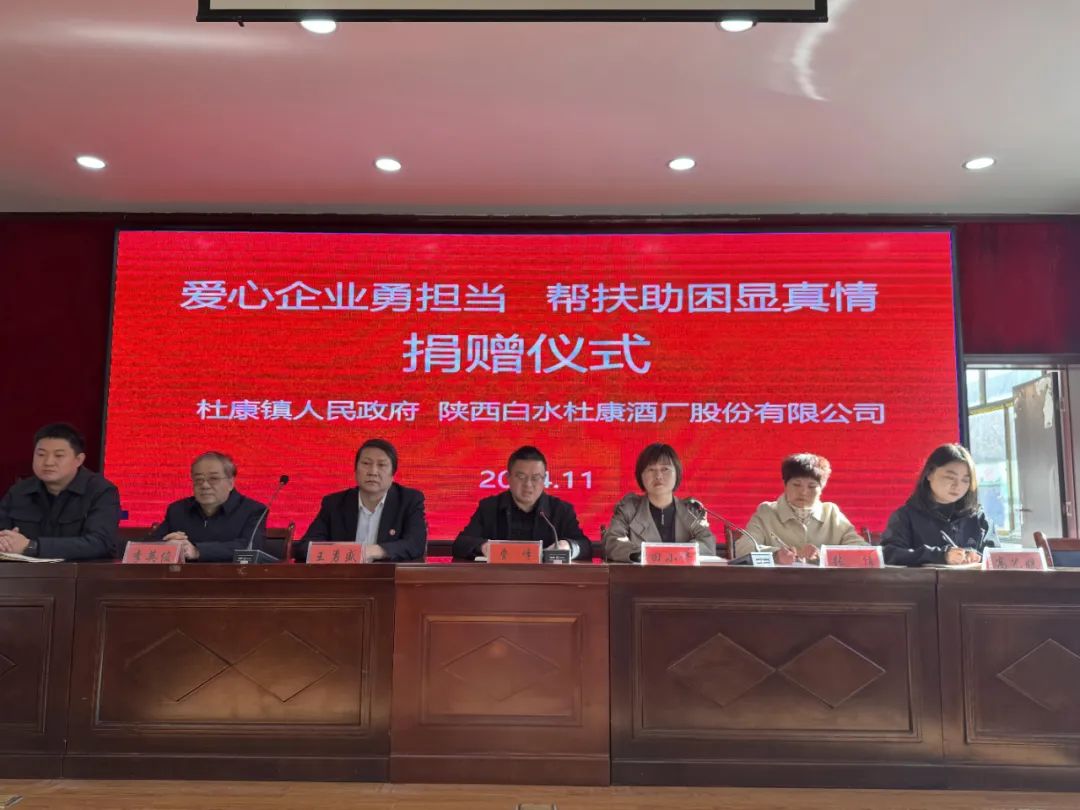 捐赠仪式在杜康镇人民政府举行,现场气氛庄重而热烈。集团总裁王勇盛、酒厂总工程师李英俊、酒厂副总经理张倩等一行领导出席了捐赠仪式,共同见证了这一善举。