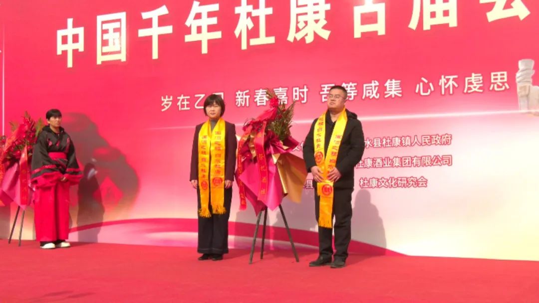 在敬献花篮环节中,杜康镇党委书记詹峰、镇长田小倩、杜康文化研究会、集团总裁王勇盛及相关部门领导、杜康后裔及传承人各界代表依次向酒祖杜康敬献花篮,表达对酒祖的崇高敬意。鲜花象征着纯洁与吉祥,寄托着后裔们对酒祖的感恩与追思。