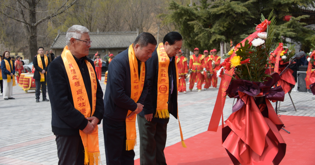 在敬献花篮仪式上,集团董事长张红军、杜康文化研究会会长种江龙等三十余家酒企及代表依次献花。花篮上的"佳酿留芳惠万秋,后世追思颂遗风"挽联,寄托着行业同仁对杜康精神的崇高敬意。